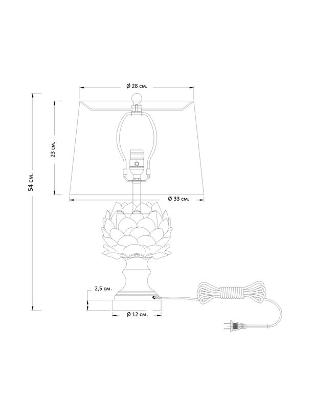 Уникальная настольная лампа с основанием в виде артишока, которая станет прекрасным дополнением к вашему интерьеру. Керамический корпус лампы выполнен в бирюзовом цвете с темно-коричневыми акцентами на кончиках каждого листа, создавая впечатление, будто они слегка состаренные. Этот необычный элемент дизайна придаёт лампе особый шарм и внесет ноту эстетики в ваш интерьер. Основание лампы выполнено из матового металла в цветовой гамме – никель, что добавляет еще больше визуального интереса и подчеркивает изящные линии и формы предмета. Круглая форма абажура идеально согласуется с общим стилем лампы и создает гармоничное зрительное впечатление. Кроме своего привлекательного внешнего вида, эта лампа также обеспечивает приятное и мягкое освещение в комнате. Вы сможете создать уютную и расслабляющую атмосферу, выбрав подходящую лампочку с мягким или теплым светом. Прекрасно подойдет для использования в спальне, гостиной или рабочем кабинете. Кроме того, эта лампа идеально впишется в любой стиль интерьера. Белый и зеленые цвета являются классическими и всегда актуальными, а форма артишока добавляет оригинальности и эксцентричности. Она будет прекрасным дополнением как к современной обстановке, так и к классическому или винтажному стилю. Кроме того, размеры этой настольной лампы позволяют разместить ее на любой поверхности, будь то стол, тумбочка или прикроватный столик. Она займет минимум места, но при этом станет прекрасным акцентом в вашем интерьере.