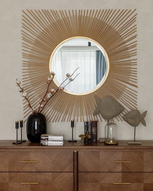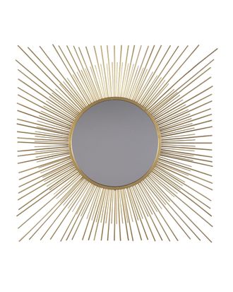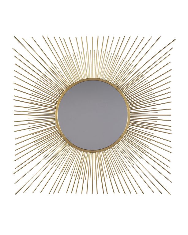 Большое зеркало солнце – современная задумка, которая имеет захватывающий дизайн в виде солнечных лучей из прочных металлических стержней, чередующиеся по длине и калибру, объединяются, чтобы выковать две неподвластные времени формы - круг и квадрат, в золотистом цвете.