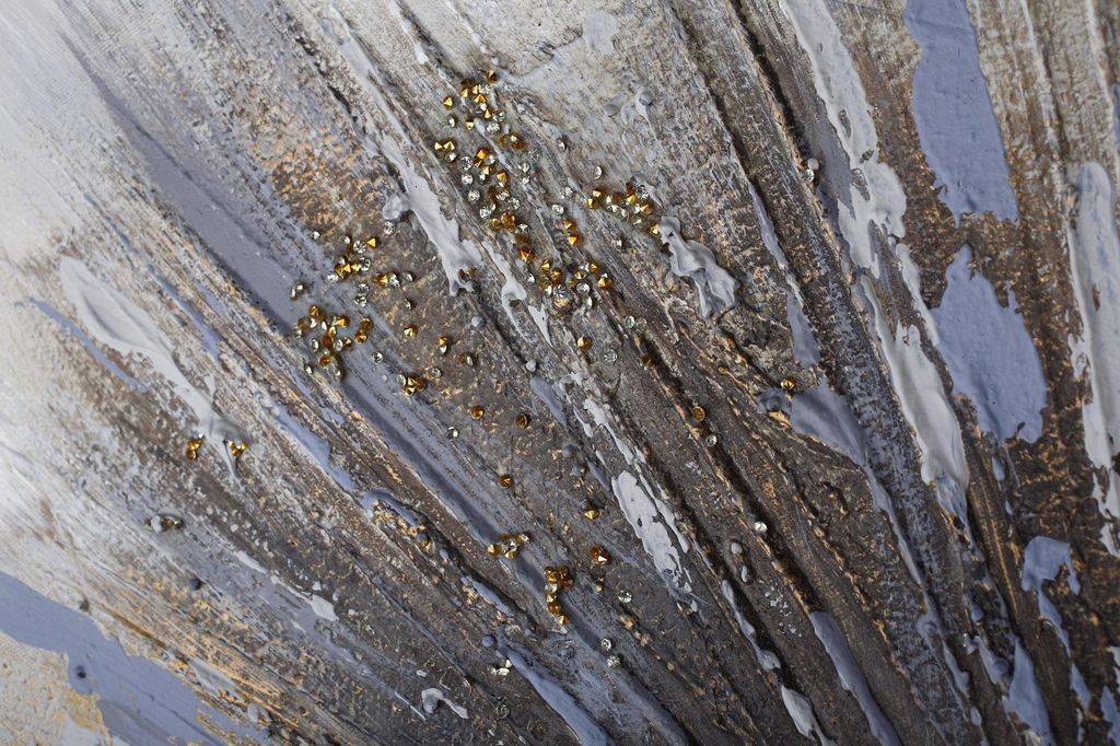 Картина выполнена путем нанесения на холст декоративной шпатлевки, страз и натуральных растений.