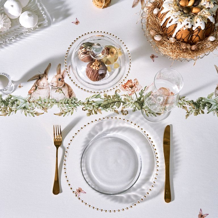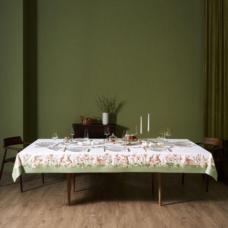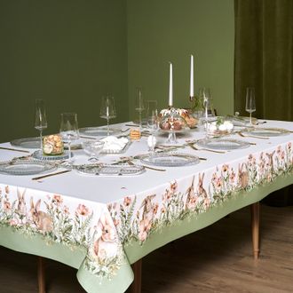 Скатерть на стол водоотталкивающая "Зайцы" наполняет дом атмосферой весеннего уюта и праздника, создавая тёплое и гармоничное настроение в сервировке стола.