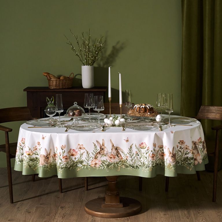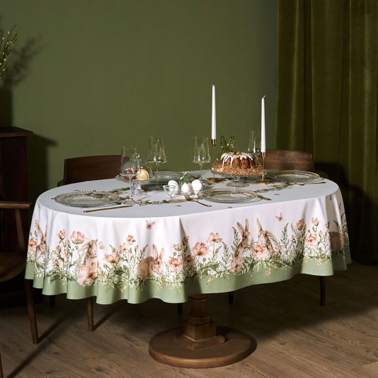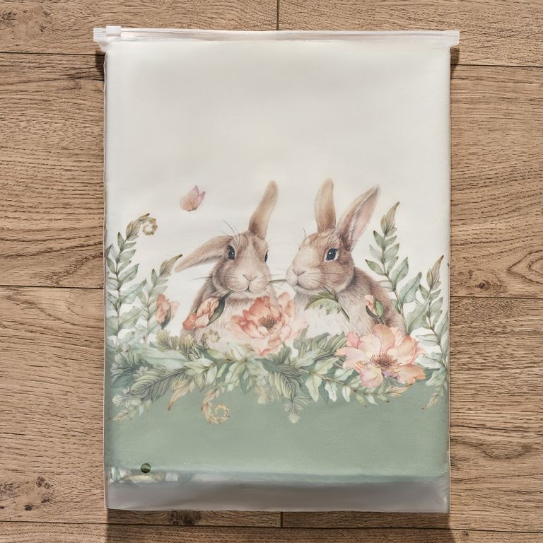 Принт с милыми кроликами, нежными зелёными оттенками и природными мотивами делает изделие выразительным элементом декора, благодаря которому стол становится центром внимания. Он создаёт атмосферу уюта и гармонии на кухне, даче или в гостиной