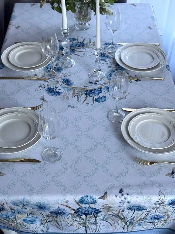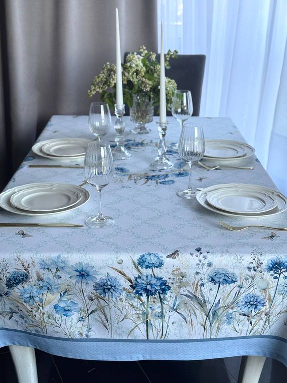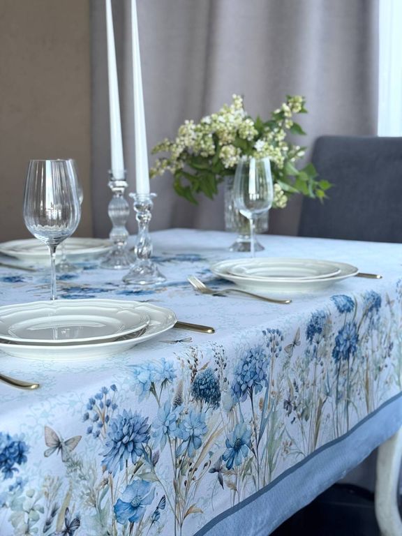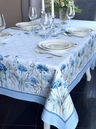 Скатерть на стол тканевая с пропиткой "Васильки" наполняет дом атмосферой уюта и праздника, создавая тёплое и гармоничное настроение в сервировке стола.