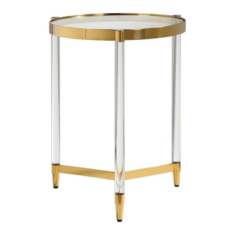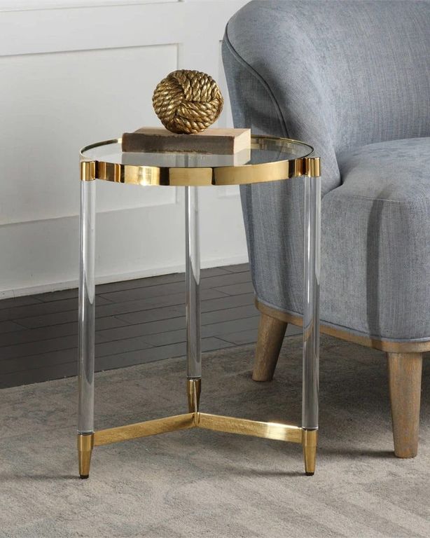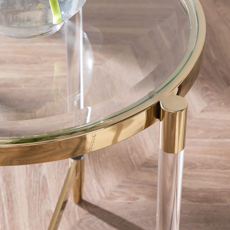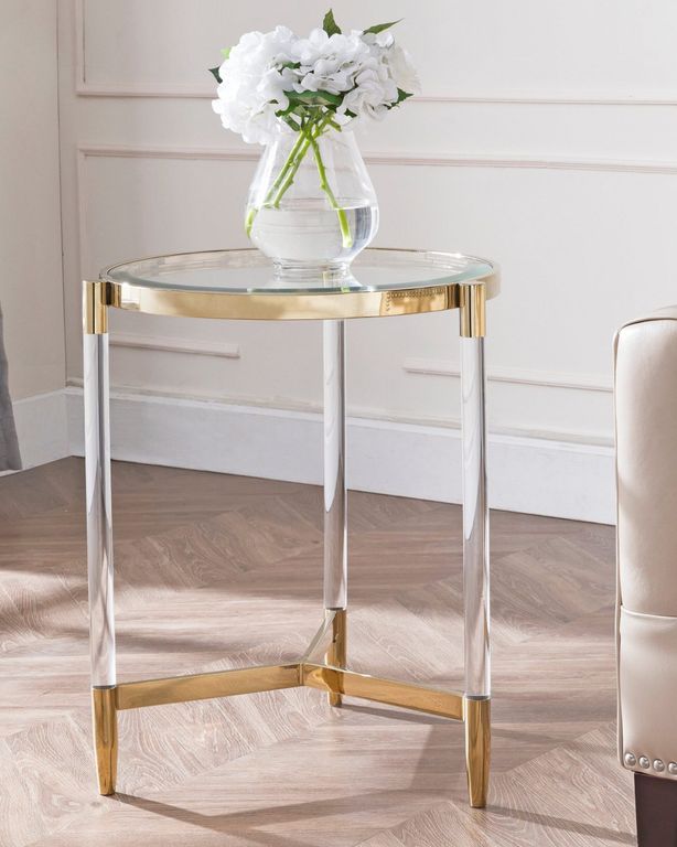 Приставной столик “Стелла” – это сочетание круглой стеклянной столешницы, акриловых ножек с отделкой из глянцевого золотого металла. Этот столик обладает современным дизайном и исключительным стилем, который непременно привлечет внимание гостей. Столешница изготовленная из закаленного прозрачного стекла, она создает впечатление невесомости и легкости, словно парящая в воздухе. Особенностью столика “Стелла” являются его ножки из прочного акрила, выполненные в центральной части столешницы по принципу треноги. Этот оригинальный элемент придает столику стабильность и прочность, сохраняя его изящный вид и характер!